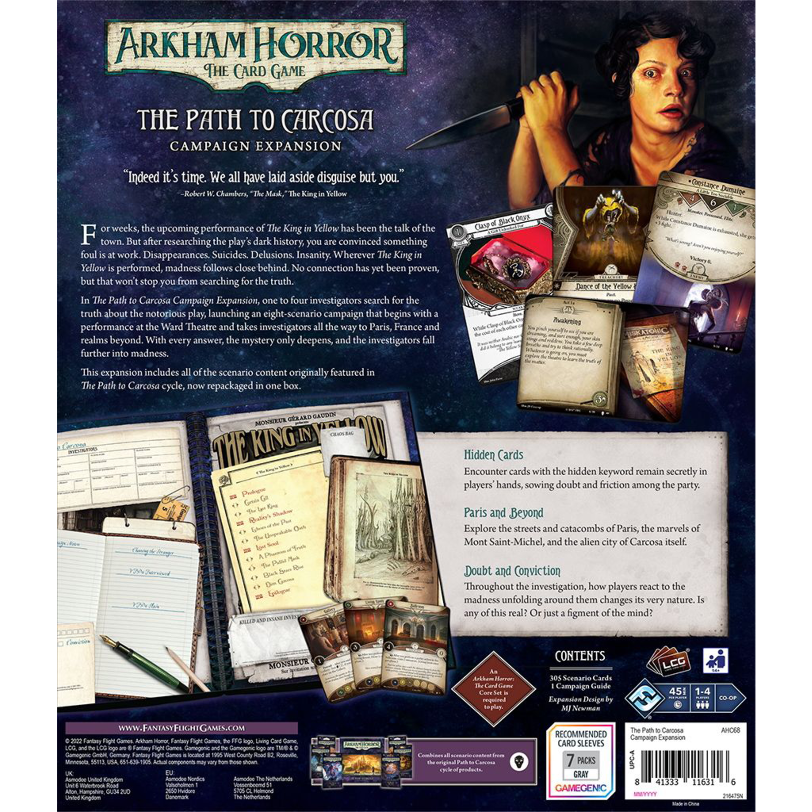 In The Path to Carcosa, the second deluxe expansion for Arkham Horror: The Card Game, it becomes your task to uncover the secrets of this unusual play. The expansion's two scenarios kick off The Path to Carcosa campaign with a trip to the Ward Theatre and an invitation to the formal dinner party hosted by cast and crew. But with every answer you gain and every clue you uncover, you only find yourself falling deeper into mystery and madness.