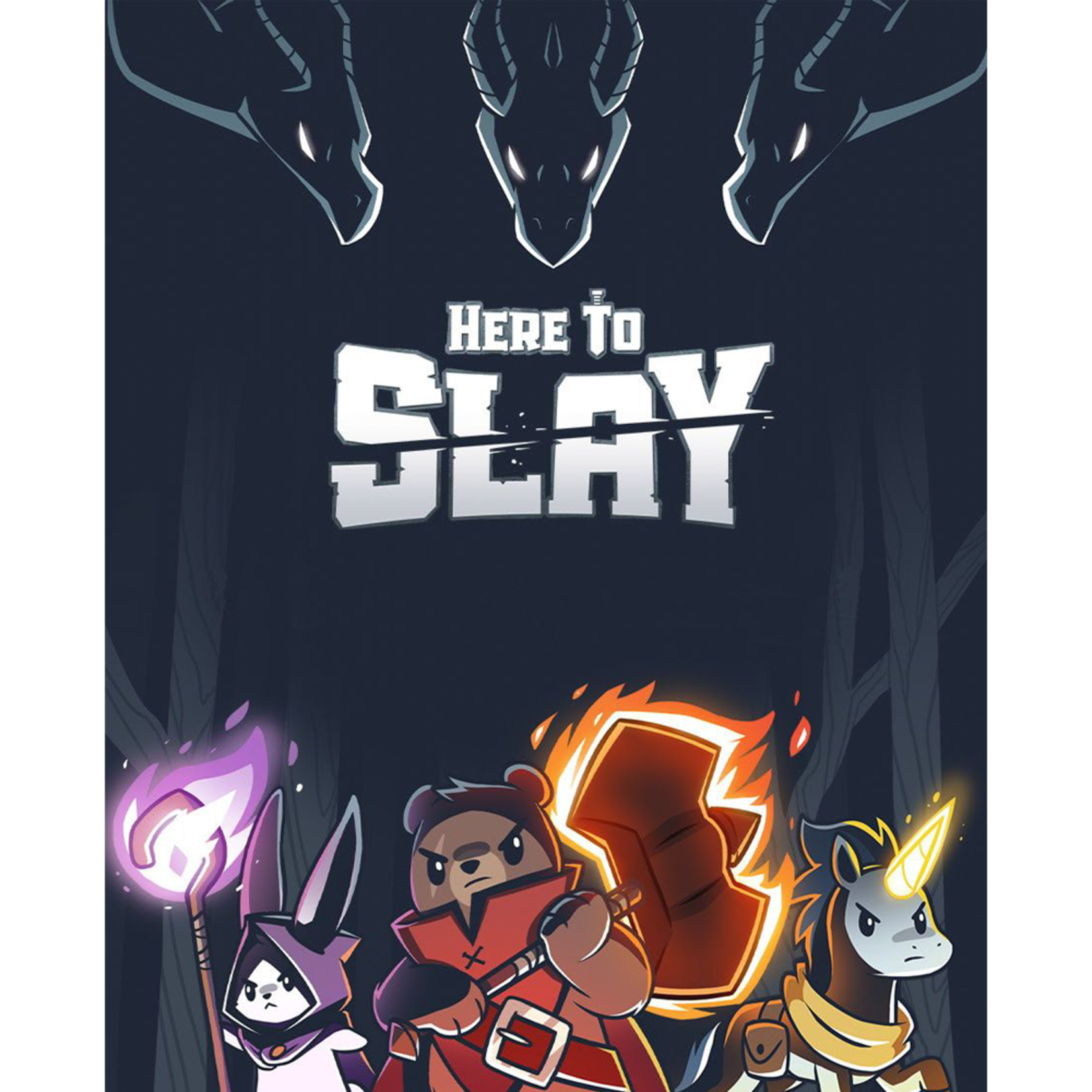 Here to Slay is a 2-6 player turn-based role-playing competitive strategic fantasy card game. In this game, you`ll assemble a full party of heroes to slay dangerous monsters while working to avoid the sabotage of your foes. The game also includes items you can equip to your heroes, 1v1 challenge cards, and roll modifiers to tip the odds in your favor.The first player to slay three monsters or assemble a full party wins the game!