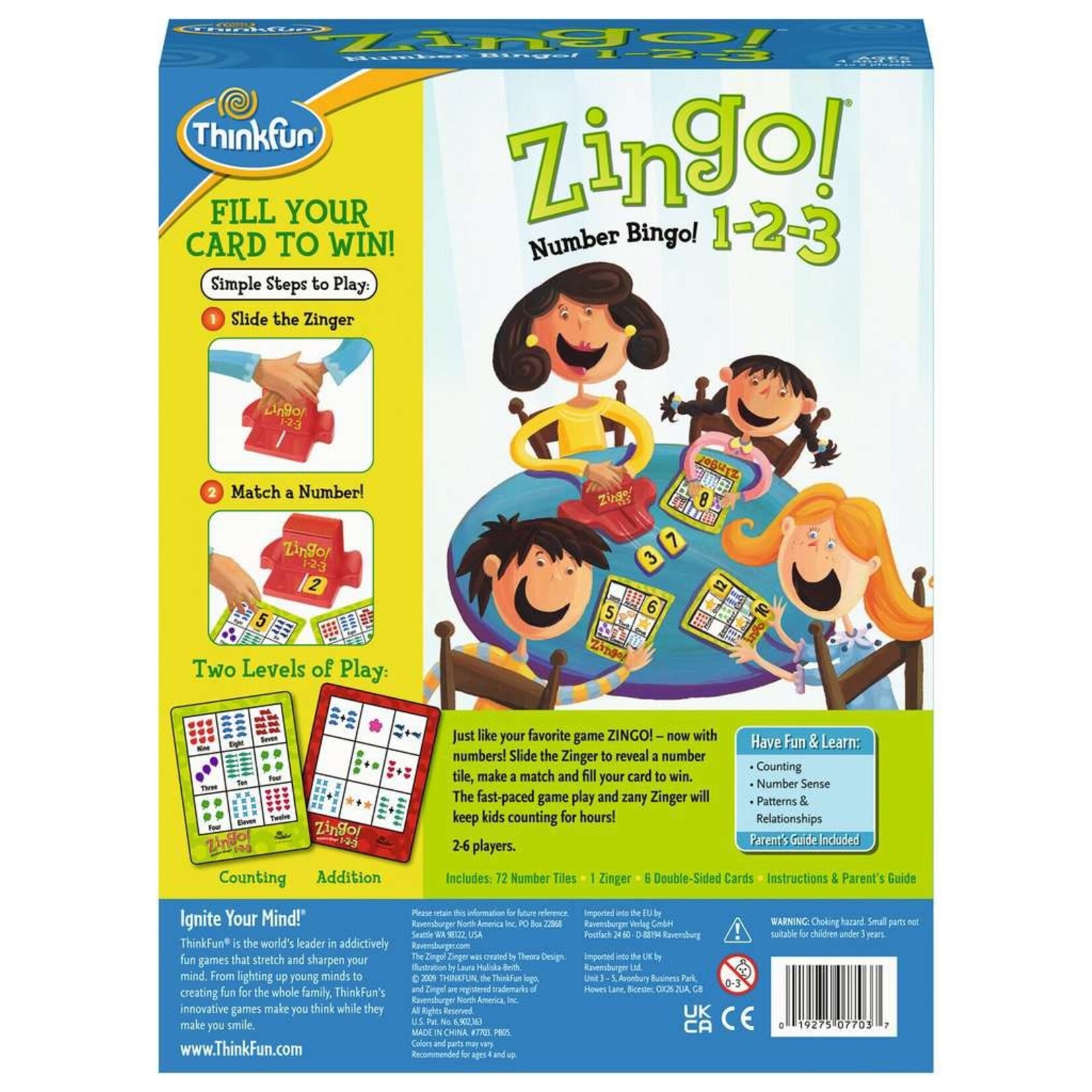 Build reading and counting skills with Zingo! 1-2-3. Match numbered spaces on your challenge card with number tiles revealed by the Zingo! Zinger.